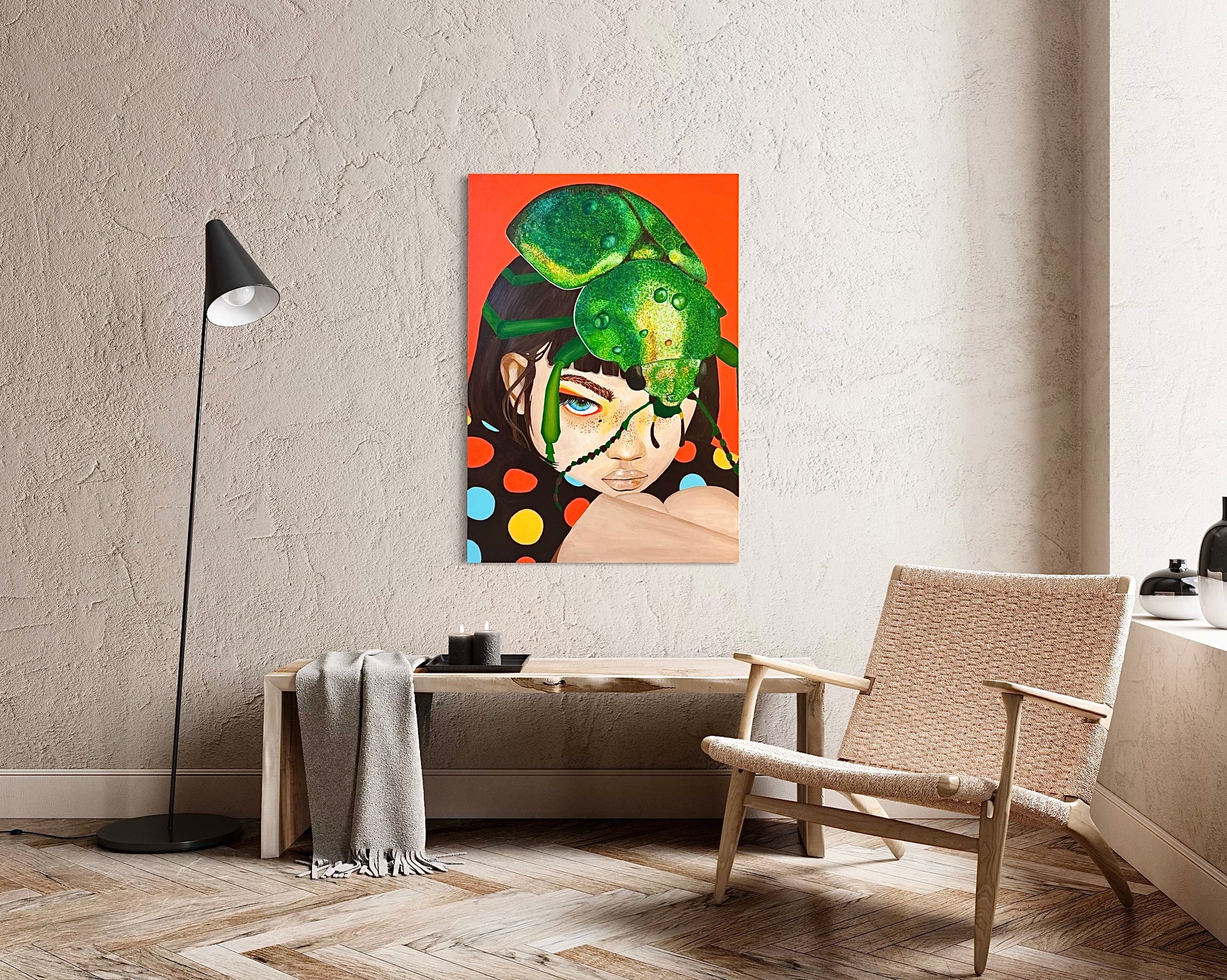 Sur sa tête, son scarabée veille comme une carapace, un compagnon protecteur qu’elle s’est créé.